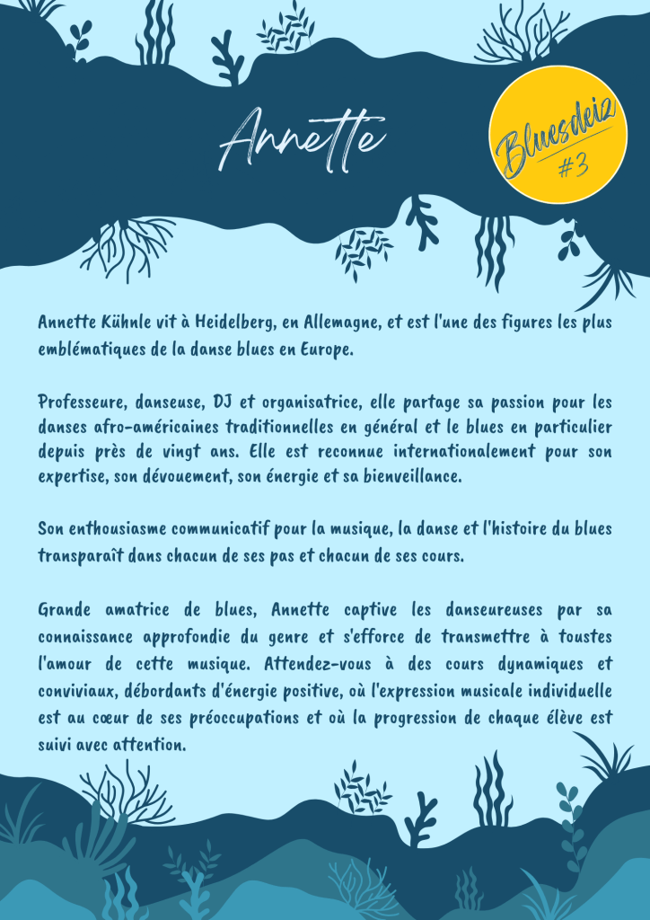 Cette année, on a le plaisir de faire venir Annette d’Allemagne. On adore son enthousiasme et son appétence insatiable du Blues ! Annette a l’habitude d’enseigner seule, on lui fait totalement confiance pour cette troisième édition !